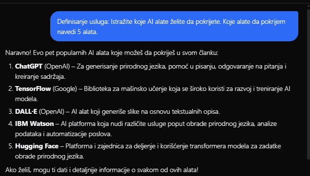Definisanje usluga: Istražite koje AI alate želite da pokrijete. Koje alate da pokrijem navedi 5 alata.