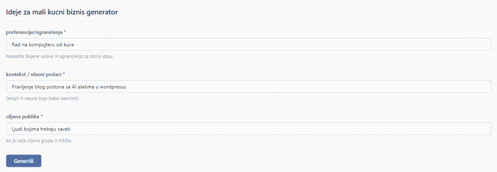 Ovo je generator koji ce uz pomoc vaseg inputa dati jedinstven output. Da, ovaj generator ce uz pomoc vestacke inteligncije naci i vama dati ideje za mali kucni biznis. Probajte sada.