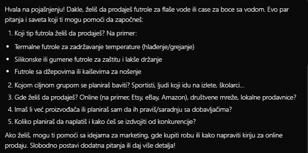 Hvala na pojašnjenju! Dakle, želiš da prodaješ futrole za flaše vode ili case za boce sa vodom. Evo par pitanja i saveta koji ti mogu pomoći da započneš: